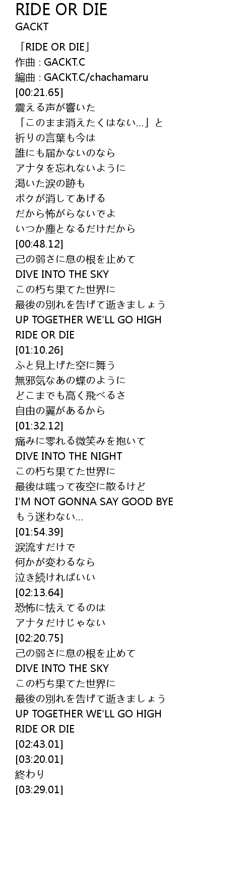 | [00:00.65] | 「RIDE OR DIE」 |