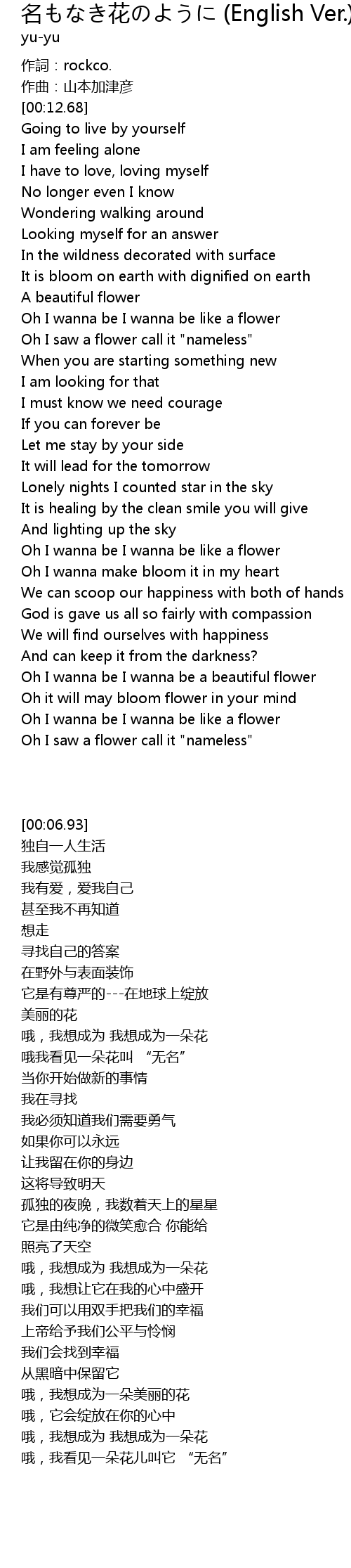 | [01:16.88] | Oh I saw a flower call it " nameless" |
