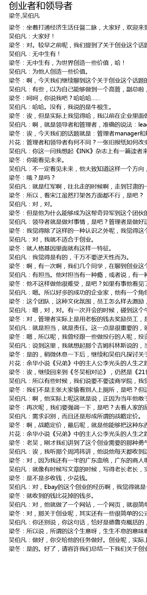| 梁冬:啊,今天我们继续聊到这个关于创业这个话题的时候呢,我发现很多公司那些高管,啊,出来呢创业,但做得并不是很好,你有没有留意到这个情况。 | |