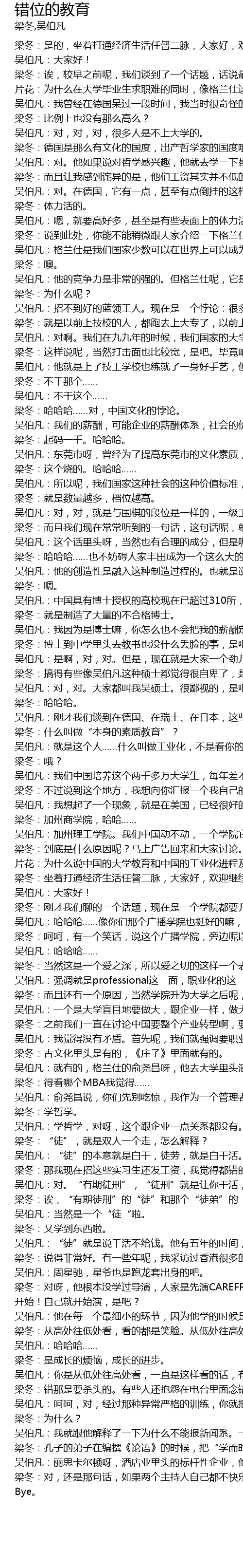 | 梁冬:诶,较早之前呢,我们谈到了一个话题,话说最近呢,这个中国呢,有一些迹象显示啊,比如说来自于房地产业,又或者是股市里面这种泡沫的这种出现。当然了,就说在这样的一片追求大好形势的要求之下呢,我们需要冷静地看待,或者说客观地看待。不过呢,作为一个有良知的传媒人,我们仍然希望经济可以朝着一个更健康、更踏实的方向去进展。所以呢这也涉及到一个老生常谈的话题,叫做中国经济的成长和转型。伯凡,从我的角度来看,我也觉得说,似乎当今中国有一种这样的倾向,不知道你有没有留意到,就是大家都想去做博士生,最好是做博士后。然后呢,如果能出国的出国,不能出国的,起码也是有一个很好的头衔,是吧?但是呢,另外一个方面呢,我们的整个产业的经济在转型和成长的过程当中呢,大量的劳动者实际上是很缺乏的。那尤其在一线工作生产线上的员工,其实质量还是有很多的提升空间。较早之前我去德国的时候,我也发现德国的产业工人他们的那种敬业的精神,让我们真的是非常非常的敬佩。 | |