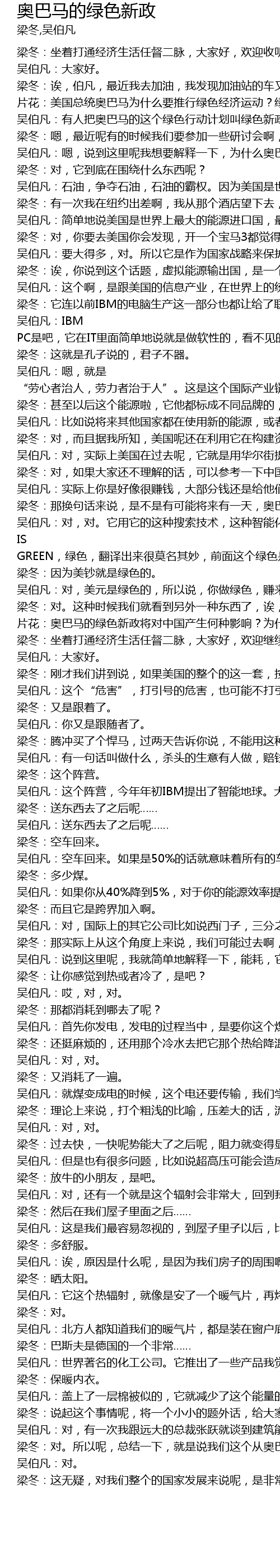 | 吴伯凡:嗯,说到这里呢我想要解释一下,为什么奥巴马会推出绿色经济运动。有人把它称为绿色新政。他是这样一个思路,他在参加竞选的时候,他在对美国近几十年的历史啊,他有了一个反省,发现美国所有的国家行为,几十年来一直在围绕着一个东西在做事情,耗费了很多的人力物力,甚至是以美国的形象为代价在做一件事情。 | |