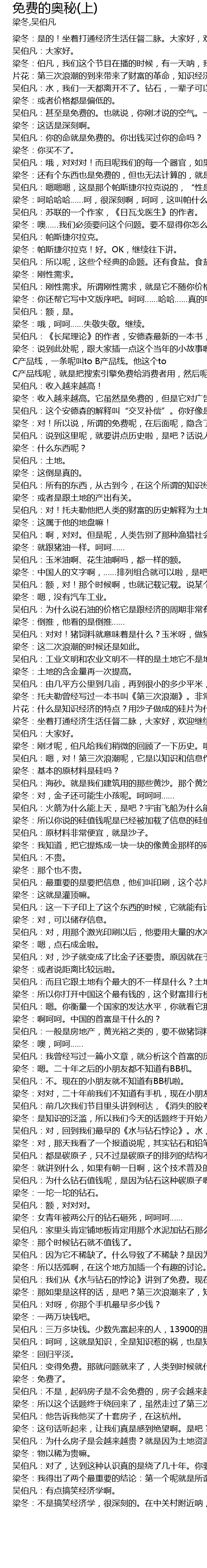 | wú bó fán: wǒ men cóng shuǐ yǔ zuàn shí de bèi lùn jiǎng dào le miǎn fèi. xiàn zài jiù qīng chǔ le, wèi shí me huì chū xiàn miǎn fèi? shì yīn wèi zuò wéi rén lèi cái fù de jī chǔ fā shēng le biàn huà. guò qù shì tǔ dì, xiàn zài shì zhī shí. bú shì quán bù de cái fù, hěn duō cái fù dōu shì gēn zhī shí yǒu guān de, ér zhī shí de tè xìng jiù zài yú tā kě yǐ bù duàn de zēng zhí. zhè yàng jiù yì wèi zhe, yīn wèi zhī shí ér chǎn shēng de chǎn pǐn hé wù zhì huì yuè lái yuè fēng fù, yǒu kě néng jiù miǎn fèi xiàng kōng qì yí yàng de fēi cháng zhòng yào dàn shì bù zhí qián la. | |