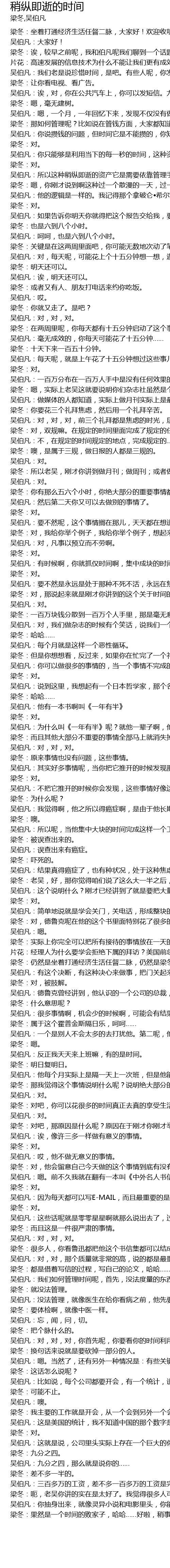 | 梁冬:那我觉得这个事情说明什么呢?说明绝大部分的人啊,如果你真的把你自己的时间用好了的话啊,你其实不用那么忙。 | |