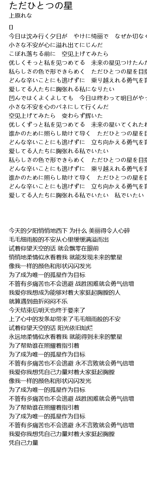 | [02:33.586] | 谁かのために照らし助けて导く ただひとつの星を目指すそのために |