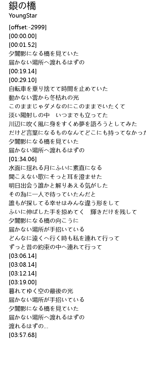 | [02:23.74] | 夕闇影になる橋の向こうに |
