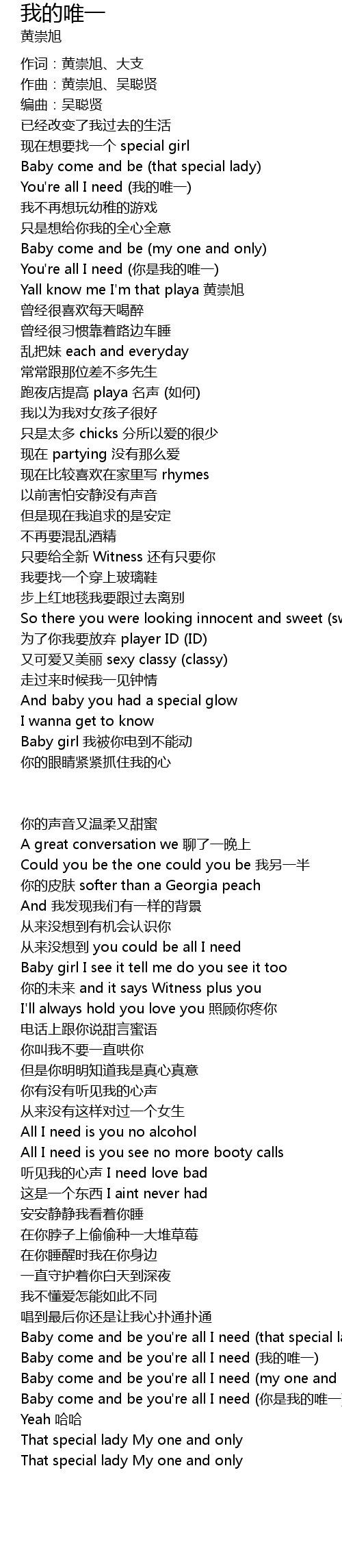 | Baby come and be you' re all I need nǐ shì wǒ de wéi yī | |