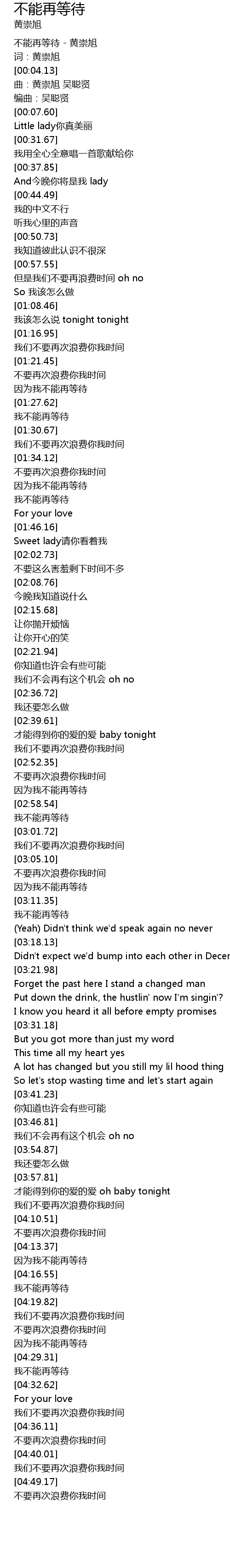 | [00:00.78] | 不能再等待 - 黄崇旭 |