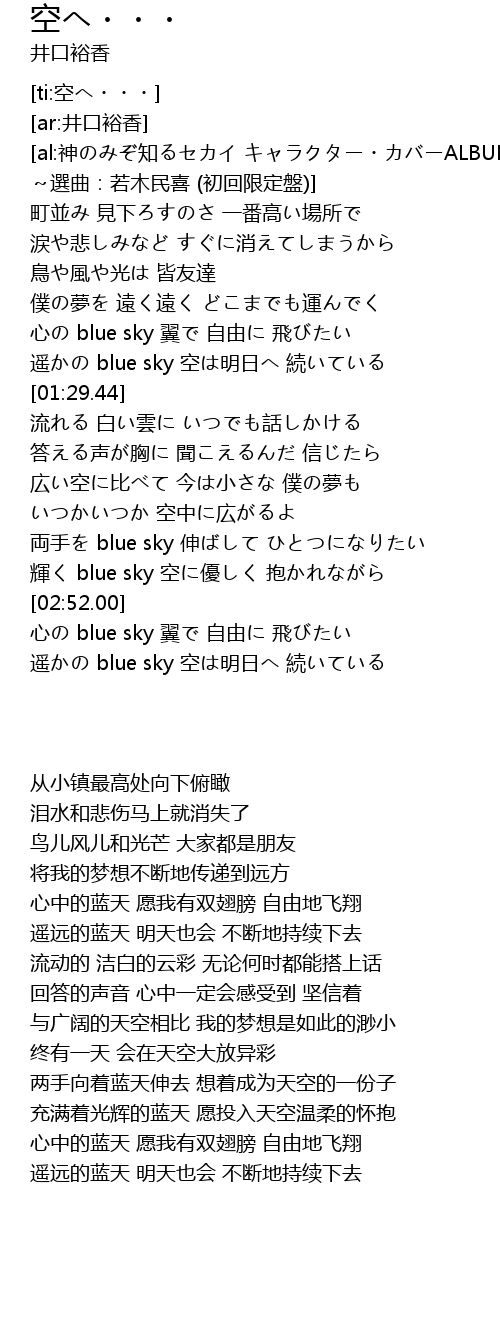 | [01:19.48] | 遥かの blue sky 空は明日へ 続いている |