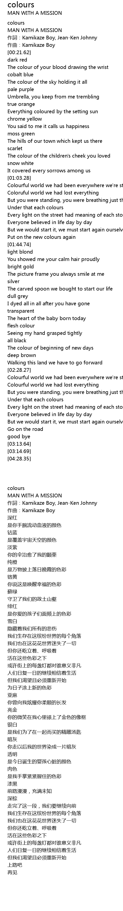 | [01:03.97] | Colourful world we had been everywhere we're standing |