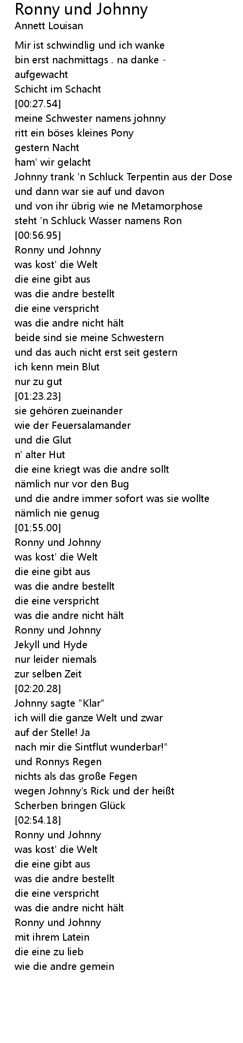 | [02:48.65] | wegen Johnny' s Rick und der hei t |