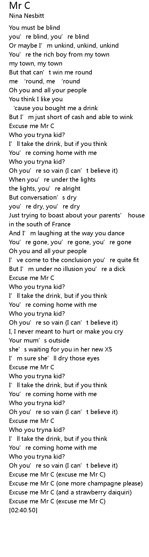 | [02:35.04] | Excuse me Mr C (excuse me Mr C) |