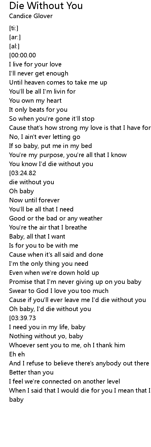 [03:32.46][03:24.82][03:17.61][03:10.43][02:40.91][01:19.56][01:12.05][01:04.73] I'd die without you