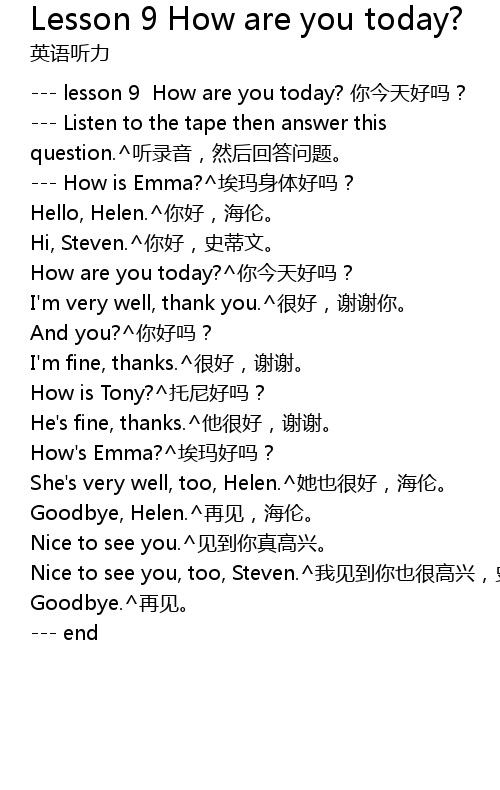 | [00:00.560] | --- lesson 9 How are you today? 你今天好吗? |
