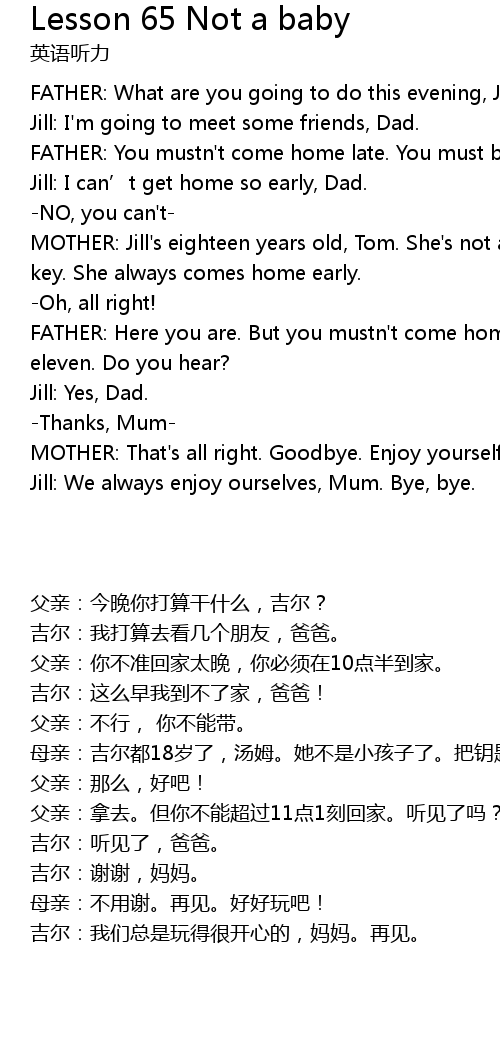 | [00:26.51] | FATHER: You mustn' t come home late. You must be home at half past ten. |