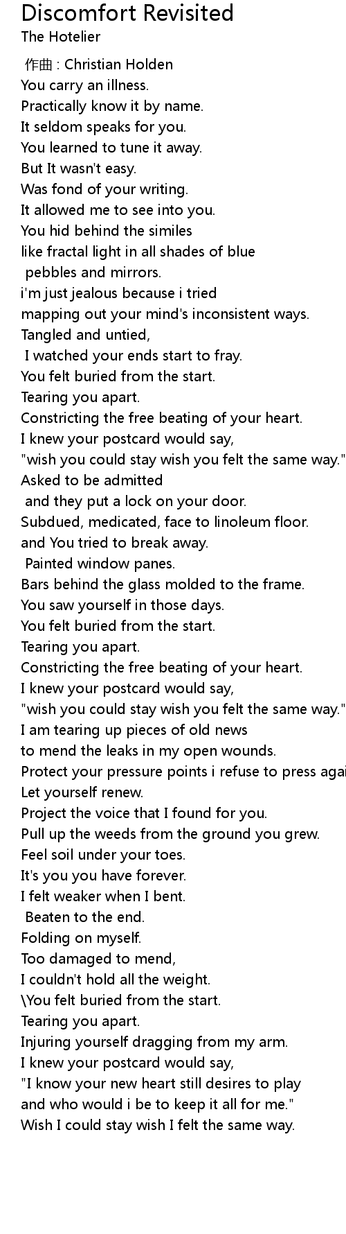 | [02:16.24] | "wish you could stay wish you felt the same way." |