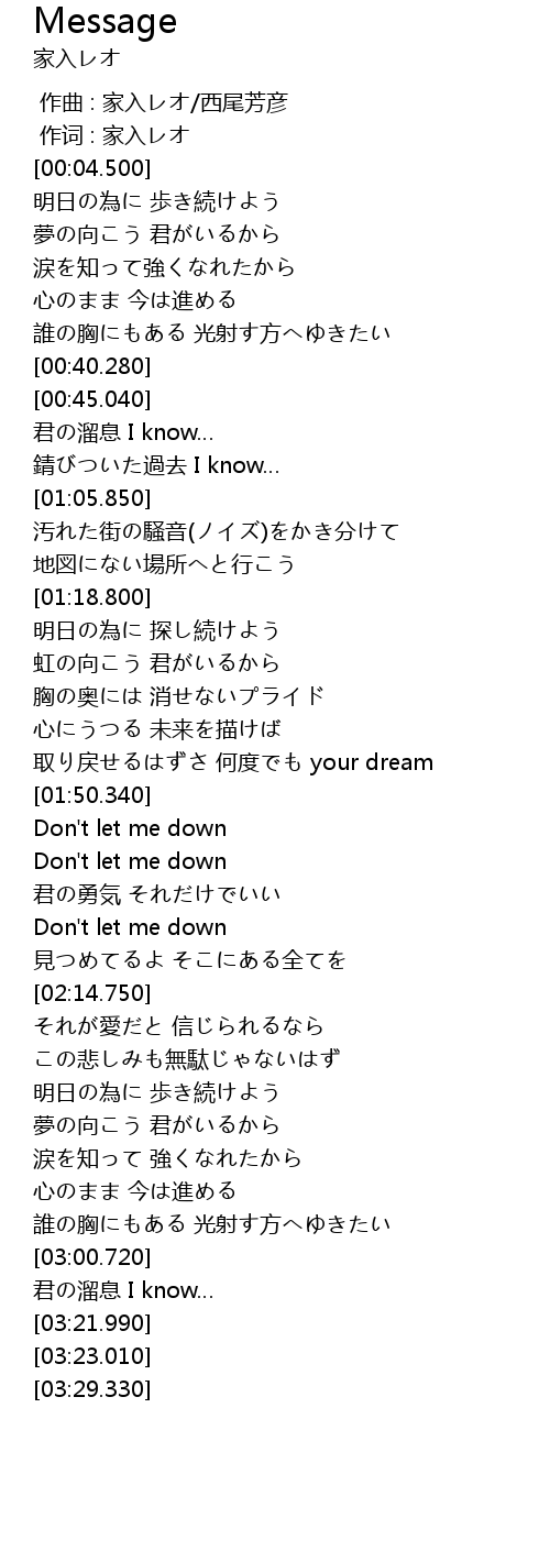| [00:00.00] | 作曲 : 家入レオ/西尾芳彦 |