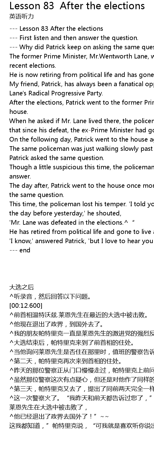 | [00:43.040] | After the elections, Patrick went to the former Prime Minister' s house. |