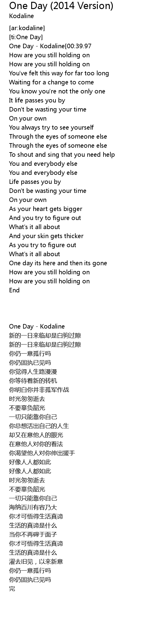 | [00:09.92]One Day - Kodaline[00:39.97] | One day its here and then its gone |