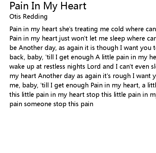 Pain in my heart she's treating me cold where can my baby be Lord no one knows. Pain in my heart just won't let me sleep where can my baby be Lord where can she be Another day, as again it is though I want you to come back, come back, come back, baby, 'till I get enough A little pain in my heart just won't let me be wake up at restless nights Lord and I can't even sleep Stop this little pain in my heart Another day as again it's rough I want you to love me, love me, love me, baby, 'till I get enough Pain in my heart, a little pain in my heart stop this little pain in my heart stop this little pain in my heart someone stop this pain someone stop this pain |
