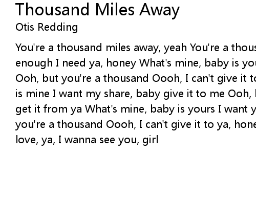 | You're a thousand miles away, yeah You're a thousand miles away, yeah Sure enough I need ya, honey What's mine, baby is yours I want you to have it honey Ooh, but you're a thousand Oooh, I can't give it to ya, honey What's yours, baby is mine I want my share, baby give it to me Ooh, but you're a thousand I can't get it from ya What's mine, baby is yours I want you to have it honey Ooh, but you're a thousand Oooh, I can't give it to ya, honey You got me sufferin' I love, ya, I wanna see you, girl |