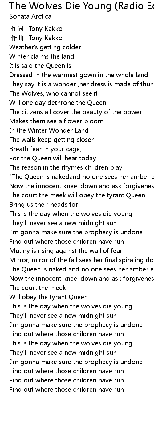 | [01:44.00] | This is the day when the wolves die young |