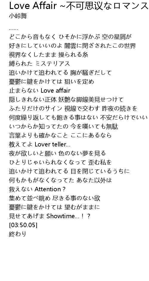 | [01:51.22] | ふたりだけのサイン 視線で交わす 昨夜の続きを |