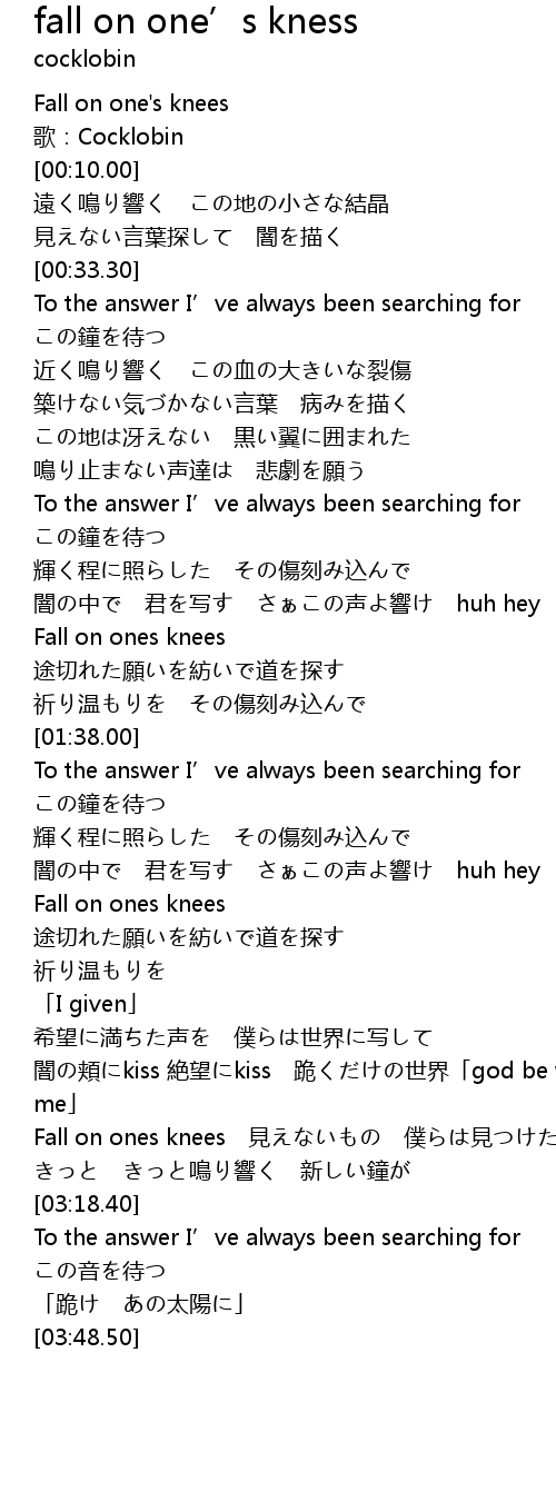 | [03:05.00] | Fall on ones knees 見えないもの 僕らは見つけたよ |