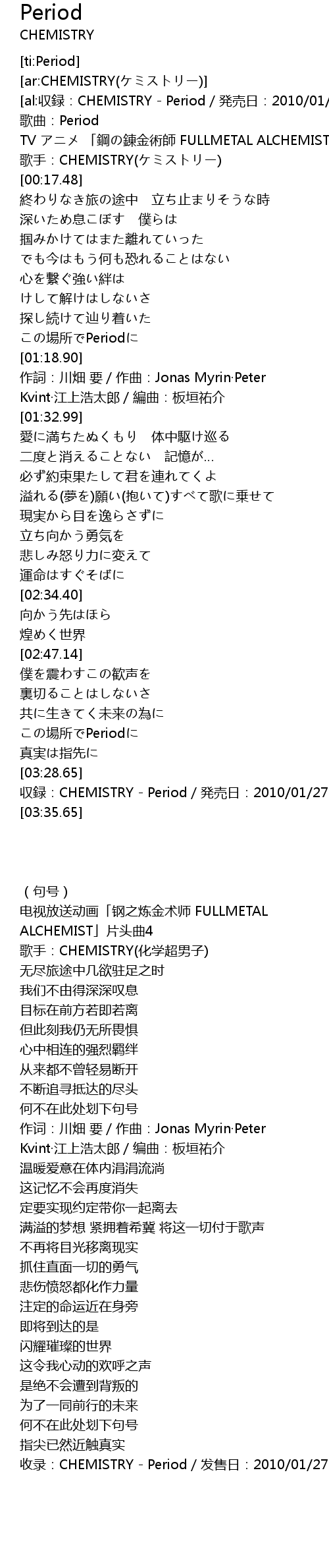 | [03:30.65] | 収録:CHEMISTRY - Period/発売日:2010/01/27 |