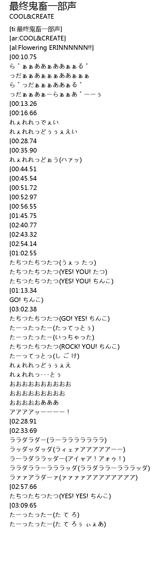 | [00:11.88][00:16.66][00:21.50][00:31.08][01:19.06][01:23.92][01:28.66] | れぇれれっでっでっ |