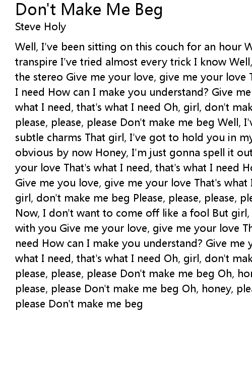 Well, I've been sitting on this couch for an hour Waitin' for something to transpire I've tried almost every trick I know Well, I've even got Sinatra on the stereo Give me your love, give me your love That's what I need, that's what I need How can I make you understand? Give me you love, give me your love That's what I need, that's what I need Oh, girl, don't make me beg Please, please, please, please, please Don't make me beg Well, I've tried to let you know with subtle charms That girl, I've got to hold you in my arms And if it ain't too obvious by now Honey, I'm just gonna spell it out Give me your love, give me your love That's what I need, that's what I need How can I make you understand? Give me you love, give me your love That's what I need, that's what I need Oh, girl, don't make me beg Please, please, please, please, please Don't make me beg Now, I don't want to come off like a fool But girl, I think that I'm in love with you Give me your love, give me your love That's what I need, that's what I need How can I make you understand? Give me your love, give me your love That's what I need, that's what I need Oh, girl, don't make me beg Please, please, please, please, please Don't make me beg Oh, honey, please, please, please, please, please Don't make me beg Oh, honey, please, please, please, please, please Don't make me beg |