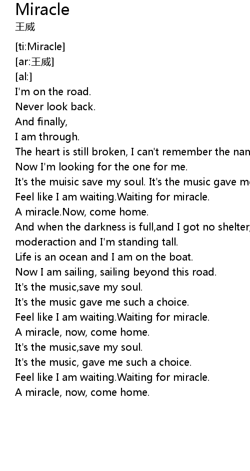 | [01:20.37] | Feel like I am waiting. Waiting for miracle. |