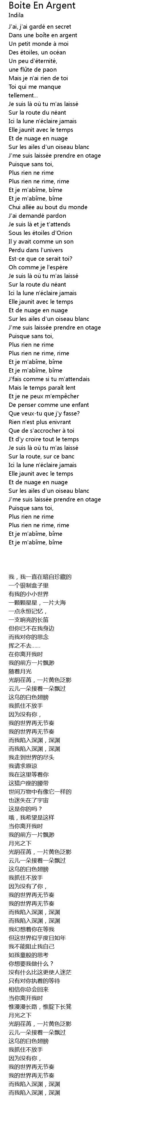 | [00:22.100] | Dans une bo te en argent |