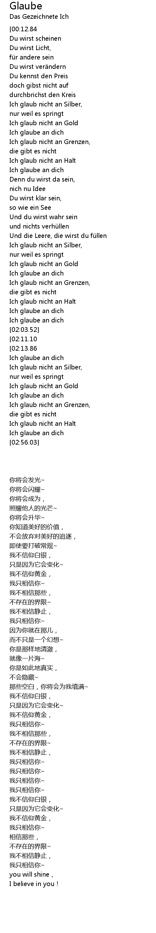 | [03:18.54][02:11.10] | Ich glaube an dich |