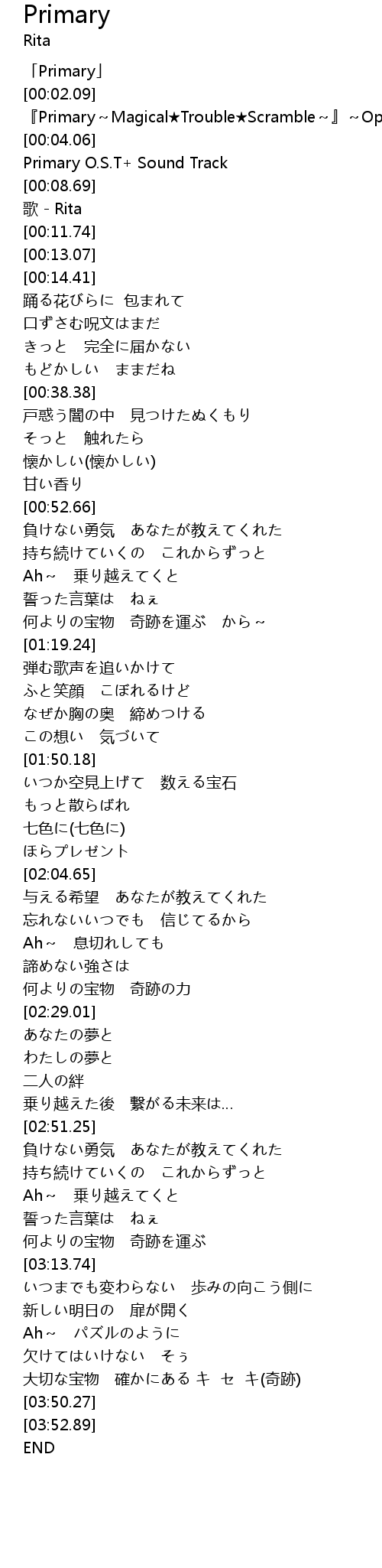 | [00:03.17] | 『Primary~Magical★Trouble★Scramble~』~OpeningTheme~ |