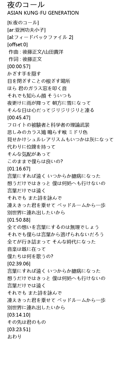 | [02:58.37] | 凍えきった君を乗せて ベッドルームから一歩 |