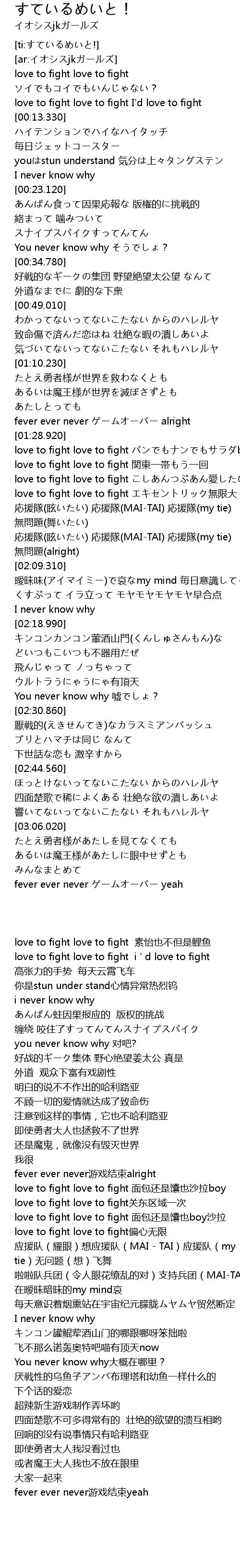 | [00:06.900] | love to fight love to fight ソイでもコイでもいんじゃない? |