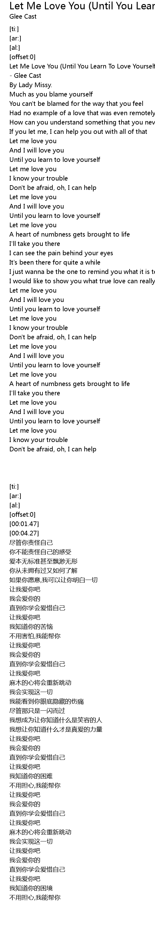 [00:01.47] Let Me Love You (Until You Learn To Love Yourself)(Glee Cast Version) - Glee Cast
