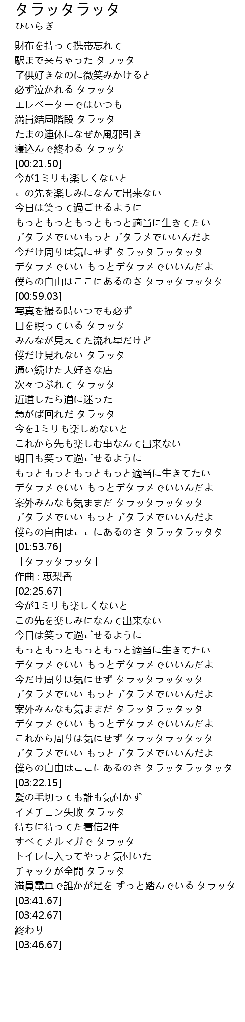 | [03:38.20] | 満員電車で誰かが足を ずっと踏んでいる タラッタ |