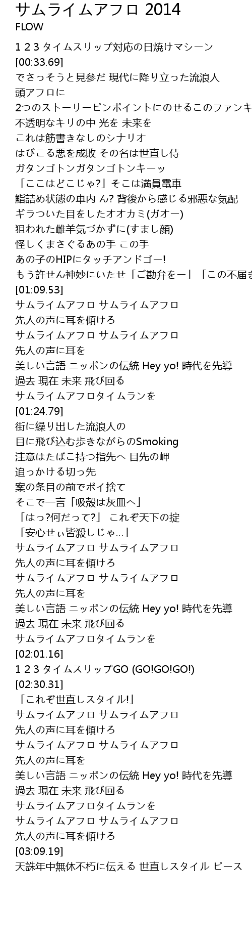 | [03:01.64] | サムライムアフロ サムライムアフロ 先人の声に耳を傾けろ |