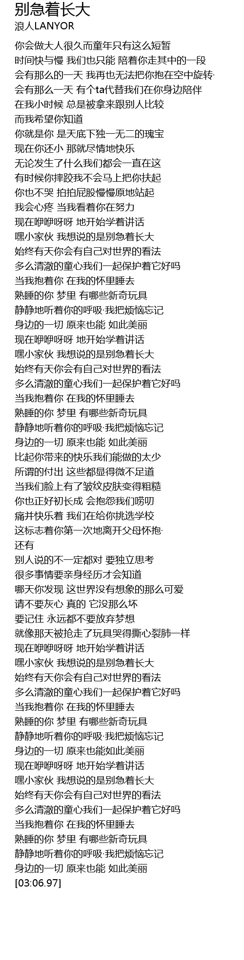 | [02:20.51] | 嘿小家伙 我想说的是别急着长大 |