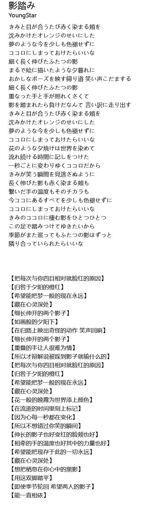 | [01:36.96] | 影を踏まれたら負けだなんて 言い訳に走り出す |