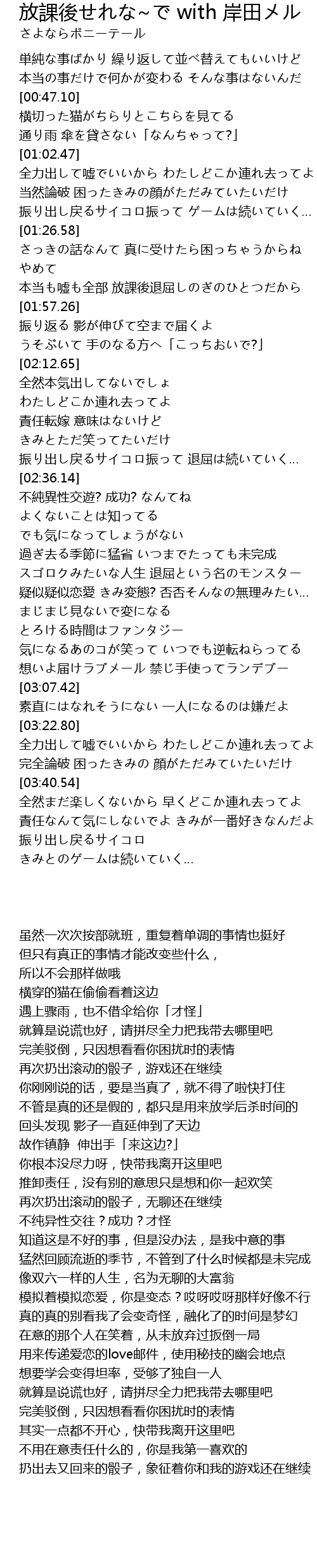 | [01:49.57] | 本当も嘘も全部 放課後退屈しのぎのひとつだから |