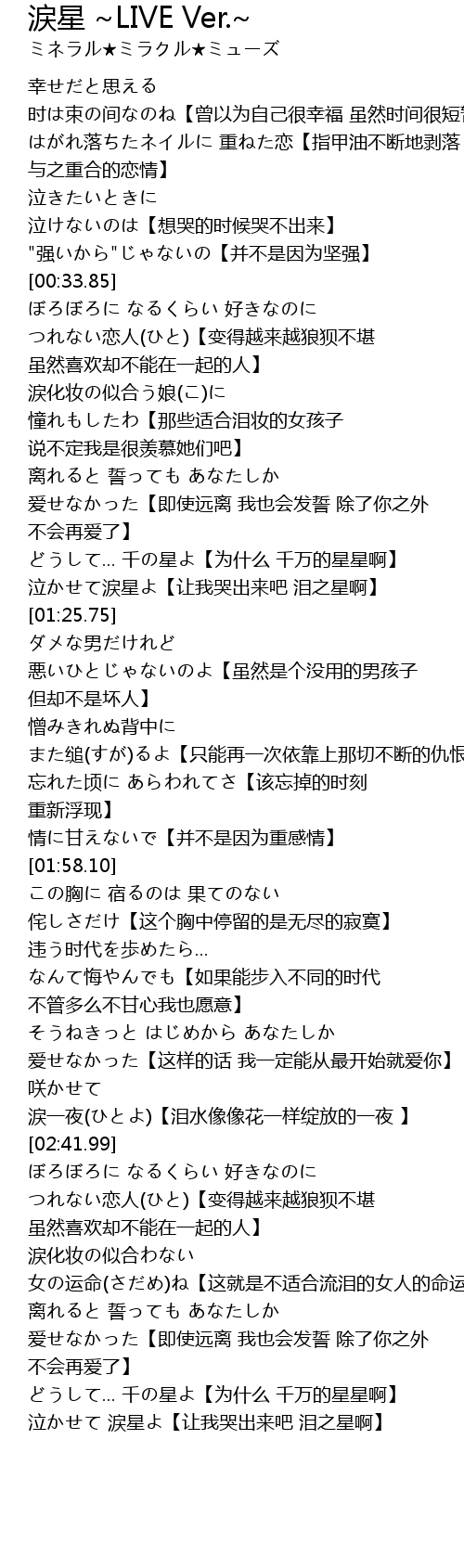 | [01:18.11] | 泣かせて涙星よ【让我哭出来吧 泪之星啊】 |