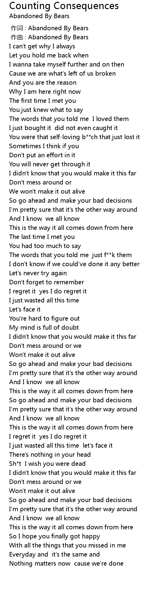 | [00:01.000] | zuò qǔ : Abandoned By Bears |