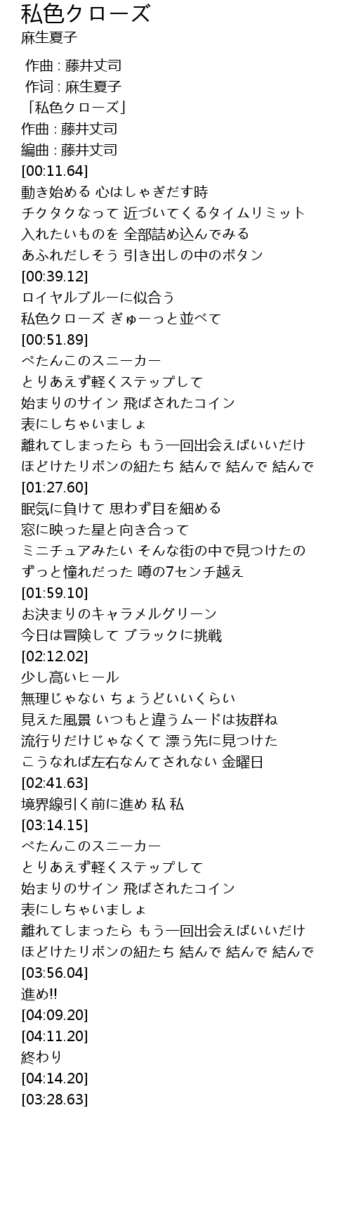 | [00:46.34] | 私色クローズ ぎゅーっと並べて |