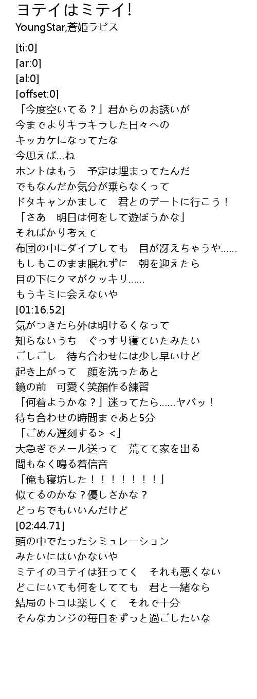 | [03:03.11] | ミテイのヨテイは狂ってく それも悪くない |