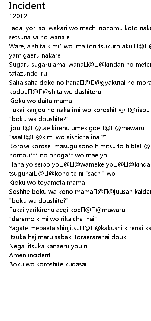 | Korose korose imasugu sono himitsu to bible@@mujitsu no onoga** wo tonaeyo hontou*** no onoga** wo mae yo | |