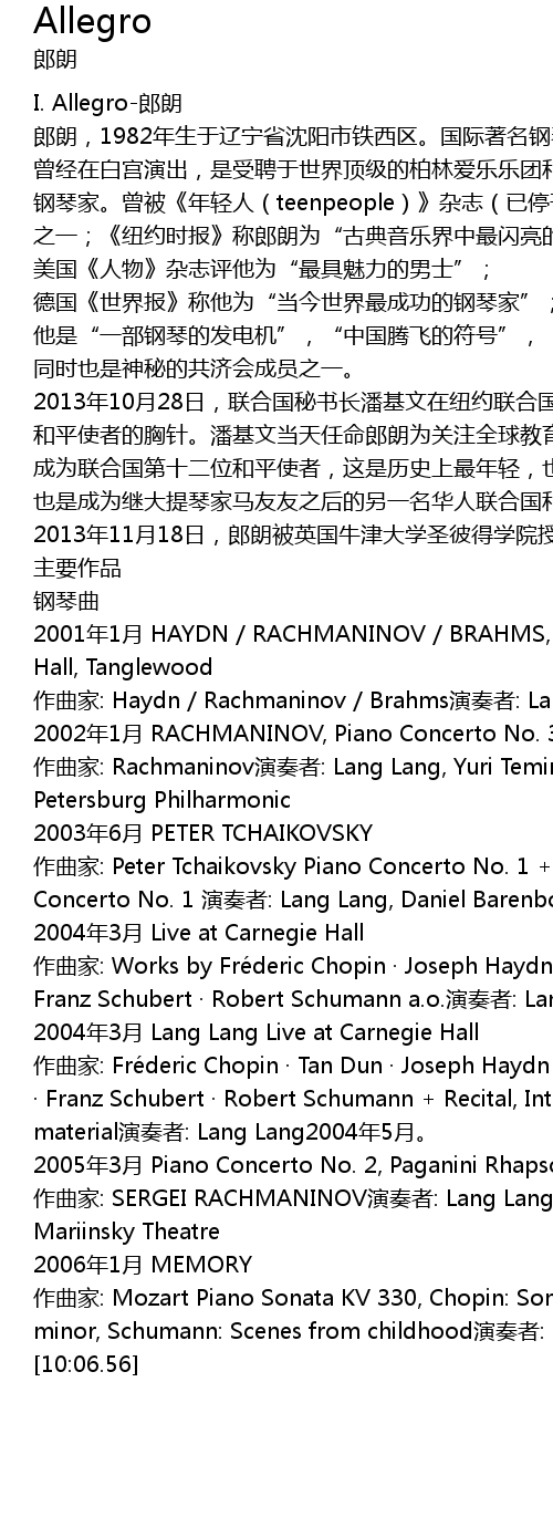 | [07:55.56] | zuo qu jia: Fre deric Chopin Tan Dun Joseph Haydn Franz Liszt Franz Schubert Robert Schumann Recital, Interviews bonus material yan zou zhe: Lang Lang2004 nian 5 yue. |
