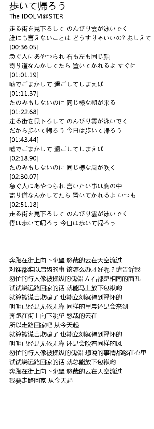 | [01:33.51] | だから歩いて帰ろう 今日は歩いて帰ろう |