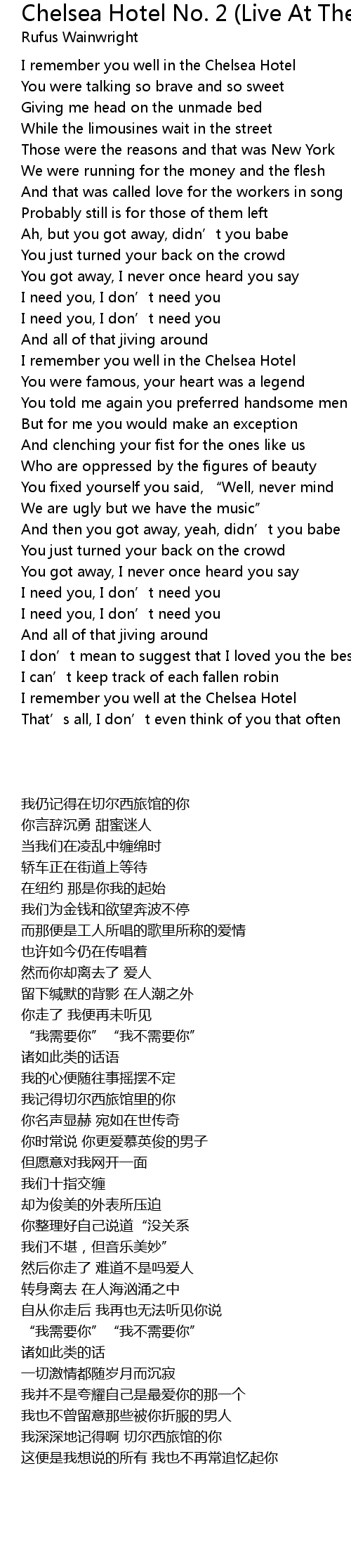 | [00:11.938] | I remember you well in the Chelsea Hotel |
